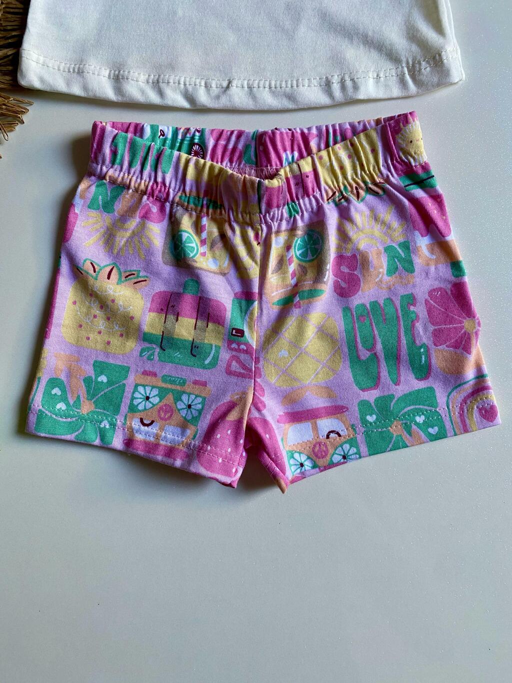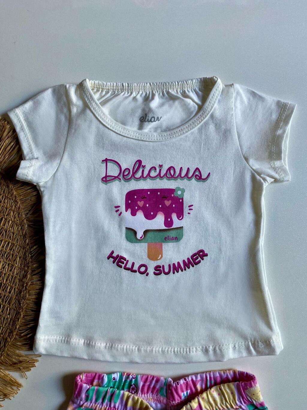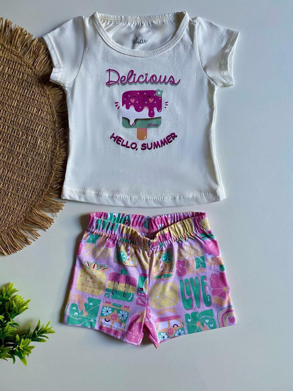 O Conjunto Bebê Menina Sorvete Elian é a escolha perfeita para looks fresquinhos e alegres. Composto por uma blusa e short em meia malha, o conjunto oferece conforto para cada movimento. A blusa em manga curta possui estampa frontal com um sorvete e uma frase. Já o short conta com elástico no cós, garantindo segurança em cada movimento, e estampa divertida e colorida em toda a peça.